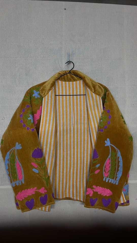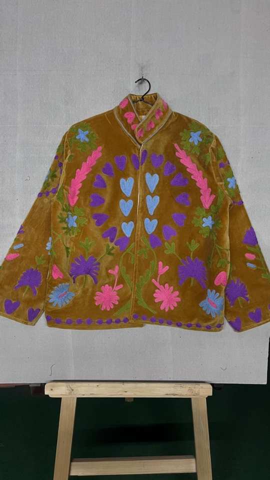 Chaqueta de Terciopelo Bordada Estilo Boho Suzani, Patrón de Corazones Coloridos, Chaqueta de Terciopelo Bordada Floral Hecha a Mano