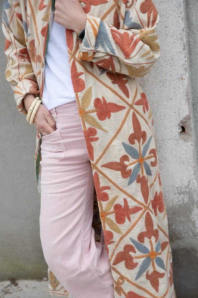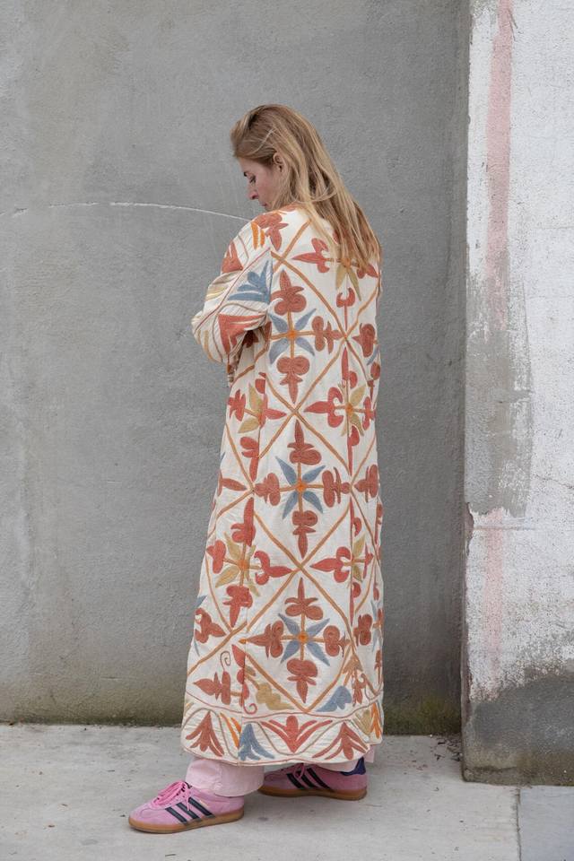 Chaqueta Acolchada Larga con Bordado Floral, Forro de Algodón Ecológico para Invierno y Otoño, Estilo Crewel, Regalo Especial de Navidad, Clásica