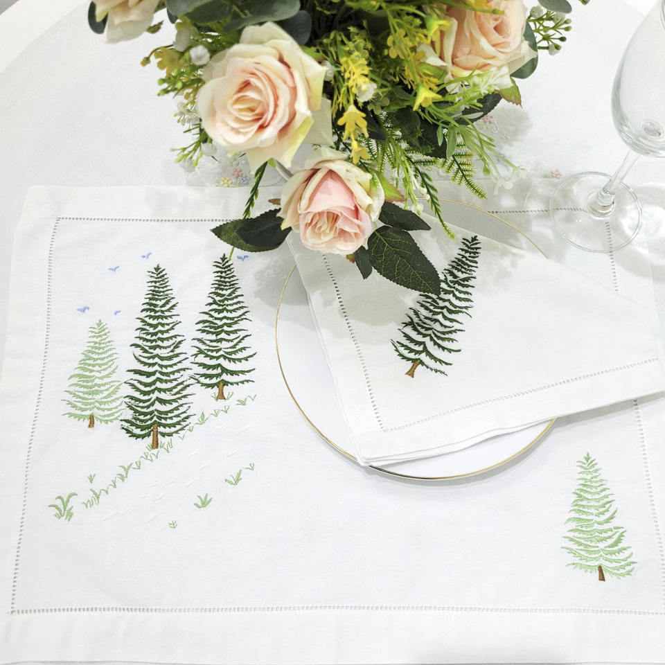 Juego de manteles y servilletas con diseño de árbol de Navidad bordado para restaurante en casa, juego de manteles individuales y servilletas de lujo de algodón blanco Hemstitch