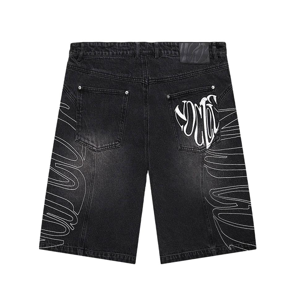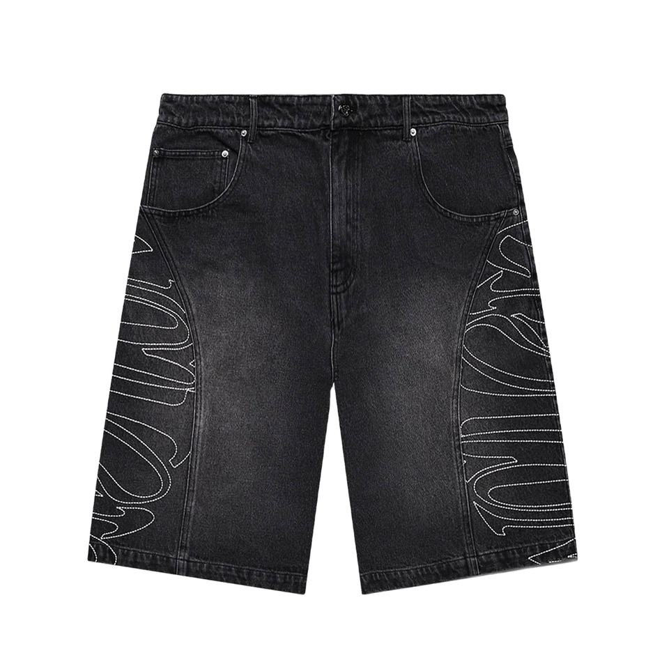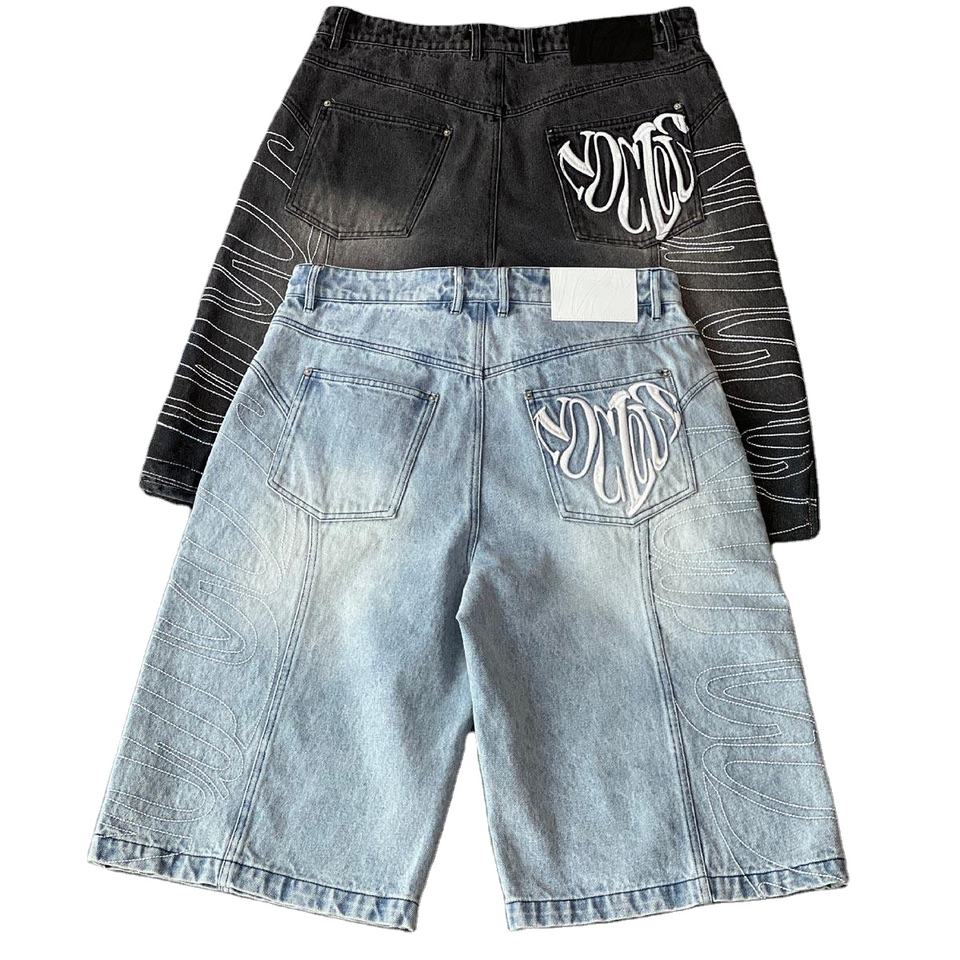 Pantalones cortos de mezclilla para hombre, con bordado personalizado, lavado a la piedra, de pierna ancha estilo globo, corte holgado y efecto descolorido por el sol