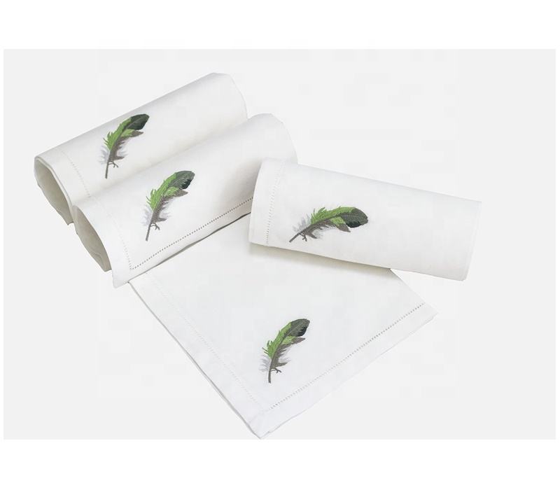Servilleta de algodón blanca de alta calidad con bordado de plumas verdes, para mesa, hogar, Hotel y restaurante