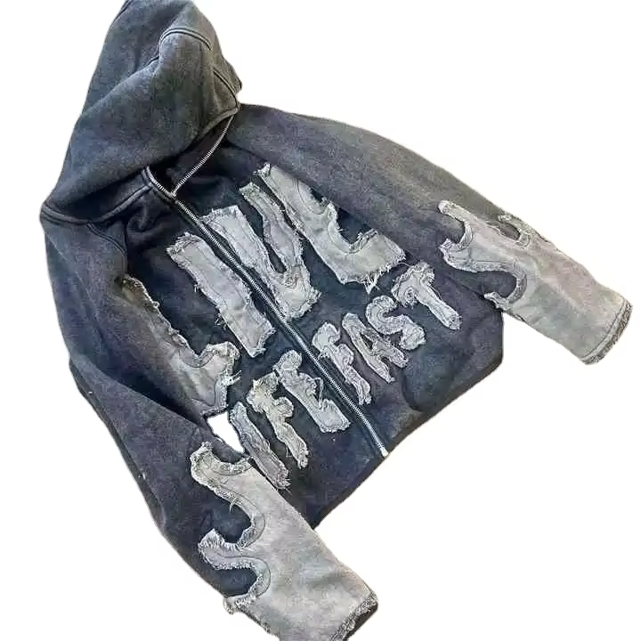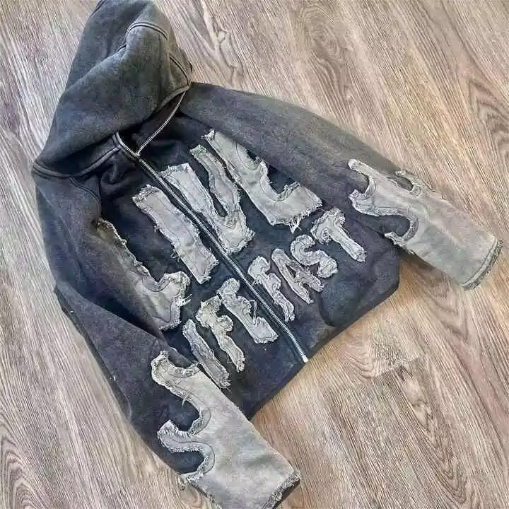 Sudadera con capucha vintage con cremallera, estilo cropped, con lavado ácido, diseño gráfico personalizado, con parche de aplique bordado y patchwork desgastado con diseño de mono