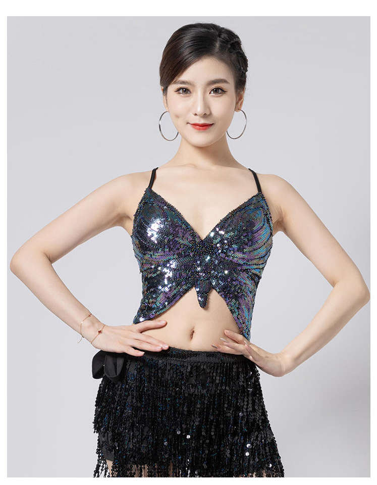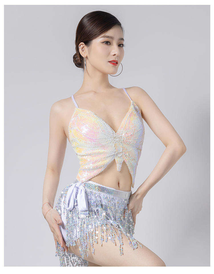 Top de Danza del Vientre para Mujer, de Poliéster, con Bordado de Mariposa, sin Espalda, Tipo Bandeau, con Velo Corto en los Hombros