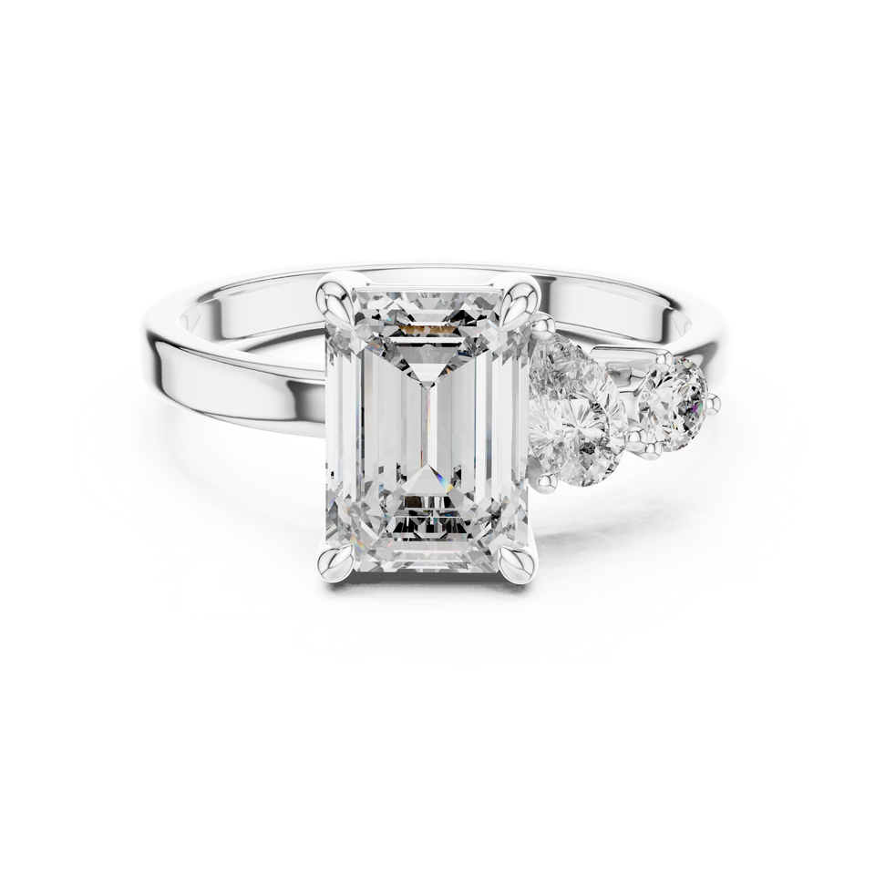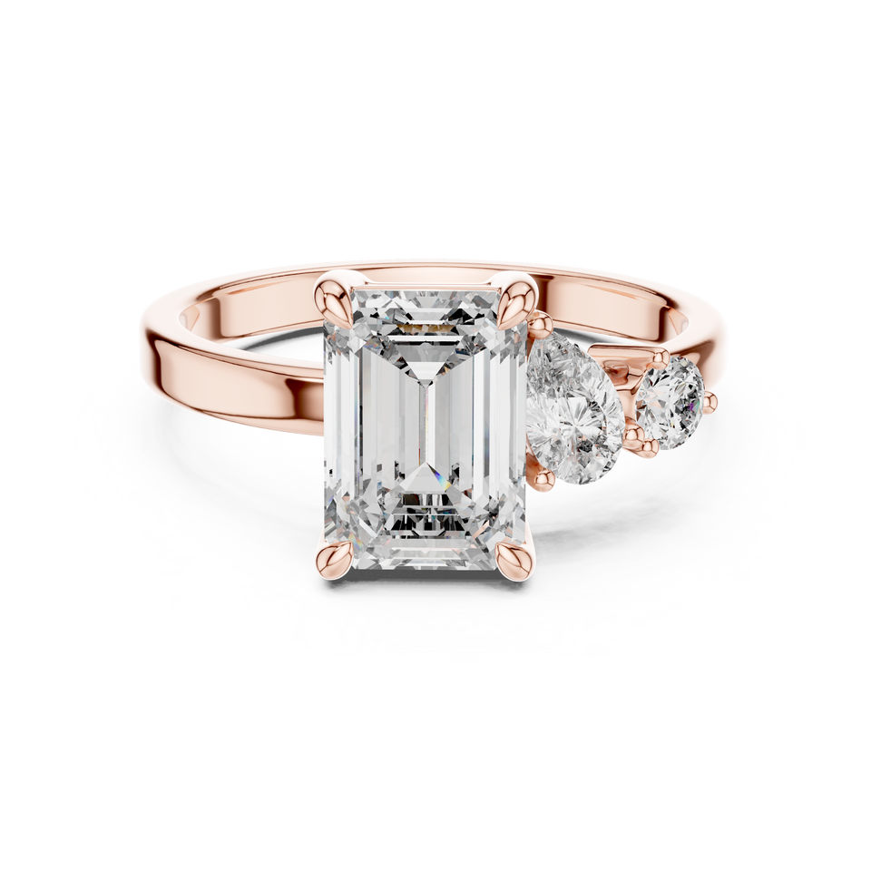 Anillo de compromiso de tres piedras con diamante de laboratorio de corte esmeralda en oro rosa con piedras laterales en forma de pera – Elegante anillo de diamantes nupcial