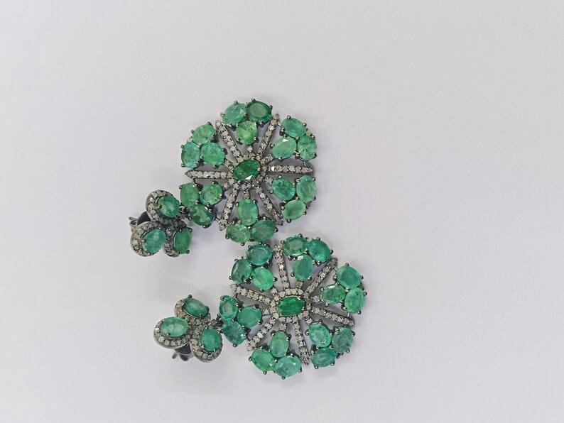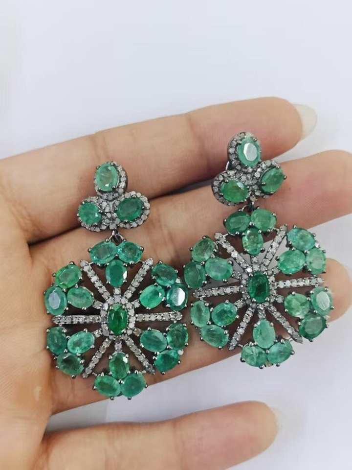 Palabra clave:Pendientes de botón con esmeralda de Zambia, circonita y detalles en blanco.