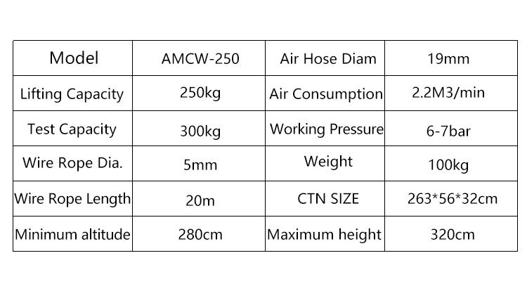 Cabrestante de rescate neumático de emergencia para operador a bordo, construcción de aluminio, parada automática, elevación de 250-500 kg, certificado CE, presión de aire de 6 bar, 10