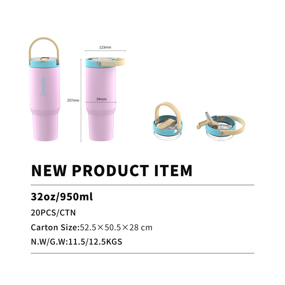 Taza de Viaje Emode OEM Design de 32 oz con Pajita Abatible Antipolvo, Vaso Térmico de Acero Inoxidable con Asa de Transporte Fácil