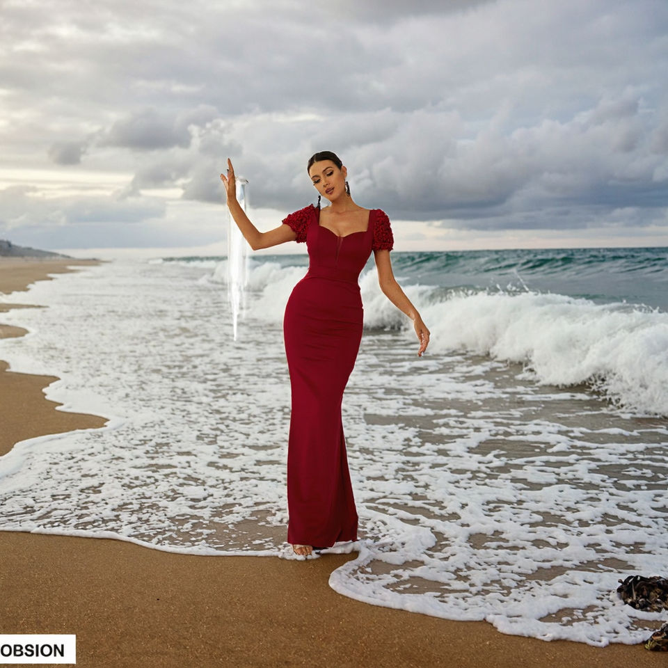 Vestidos de noche largos de sirena Empire Ruffles en color rojo vino, con mangas abullonadas de crepé, sujetador incorporado, transpirables, antiestáticos y de longitud hasta el tobillo.