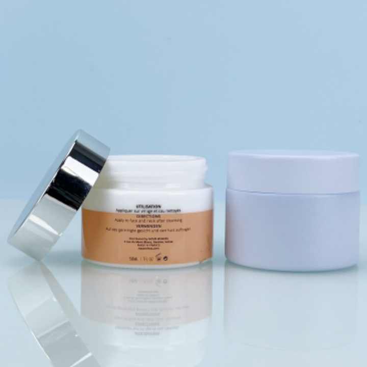 Envases Cosméticos Vacíos, Serigrafía, 30g, 50g, Frasco Redondo de Vidrio Blanco Opal Azul Mate con Tapa Plateada