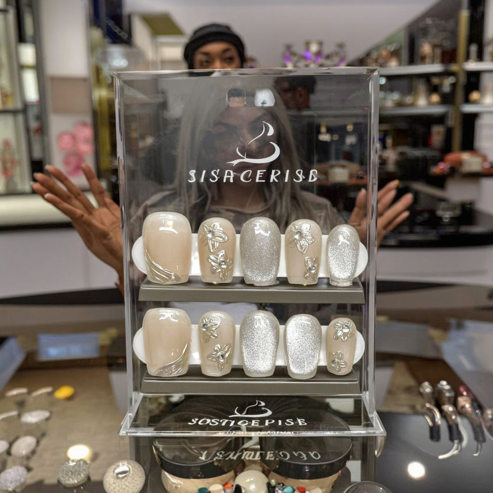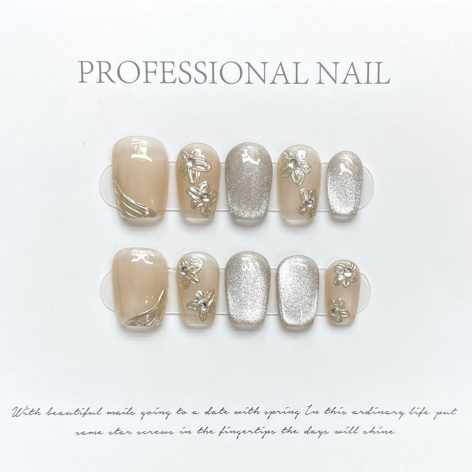 Uñas Postizas de Esmalte con Diseño Floral Metálico 3D, Estilo Ojo de Gato, Hechas a Mano, para Piel Clara, Removibles