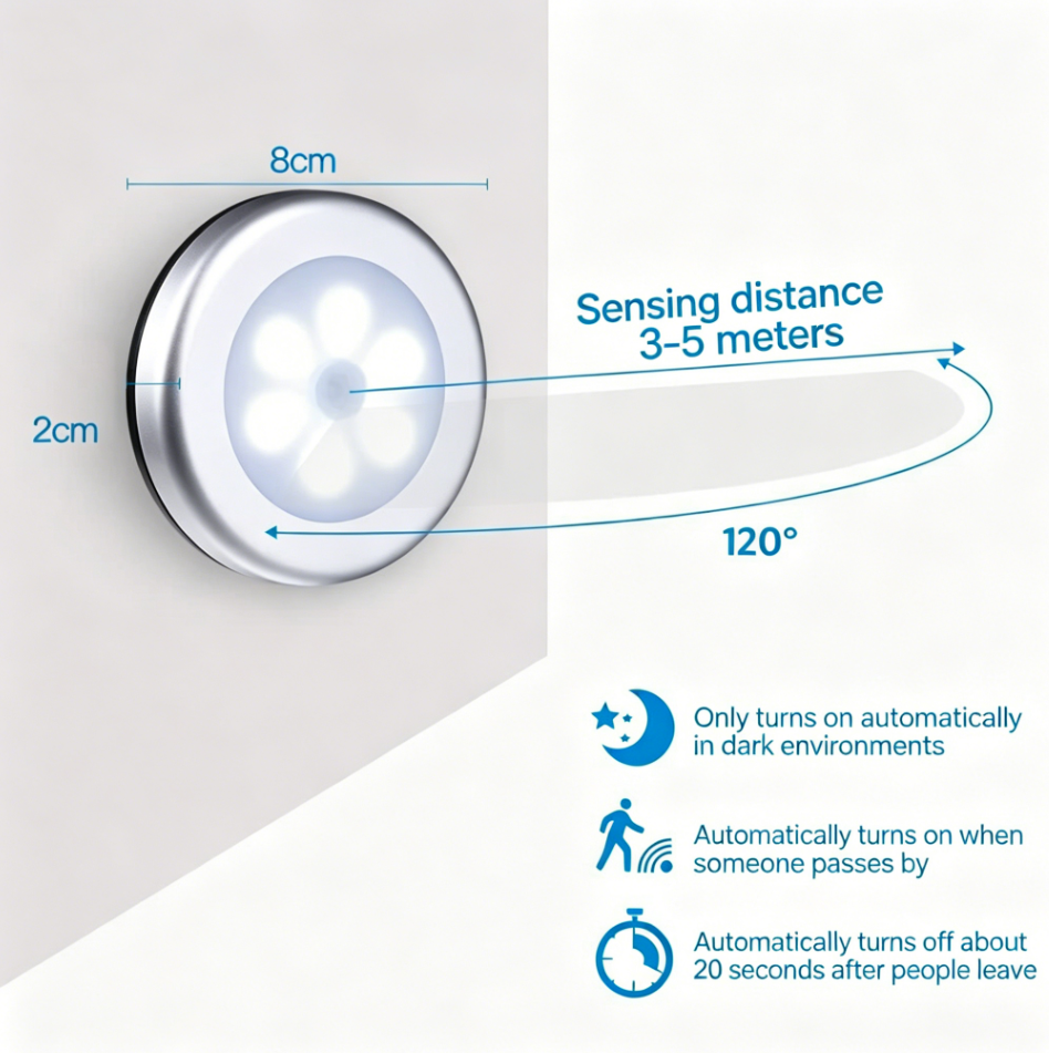 Luz Nocturna LED Circular de Ahorro de Energía, con Sensor de Movimiento Magnético y Funcionamiento a Batería para Armario, Pasillo, Escalera