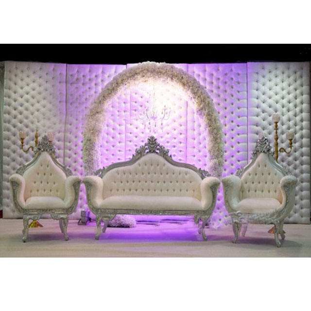 Panel de cuero blanco y plateado para recepción de boda, hermoso escenario, Inglés