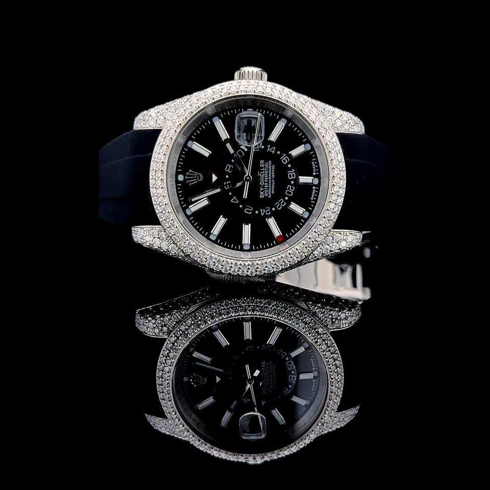 Mejora la moda con el reloj de diamantes de moissanita con función de fecha y banda de goma negra estilo Hip Hop para hombres y mujeres.