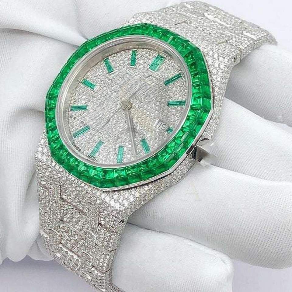 Reloj de diamantes de corte esmeralda con piedras preciosas verdes personalizadas con claridad VVS mejorada Hip Hop VVS Moissanite Diamond Trending Watch para hombres