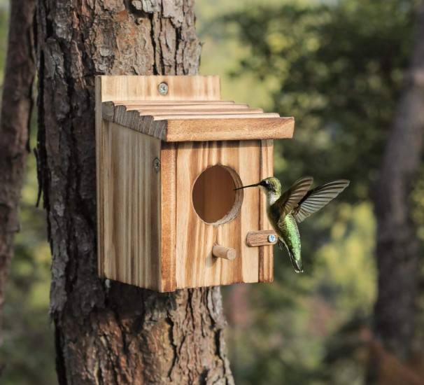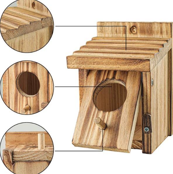 Casa de pájaros respetuosa con el medio ambiente hecha de madera sostenible ayuda a mantener la vida silvestre local y la diversidad biológica