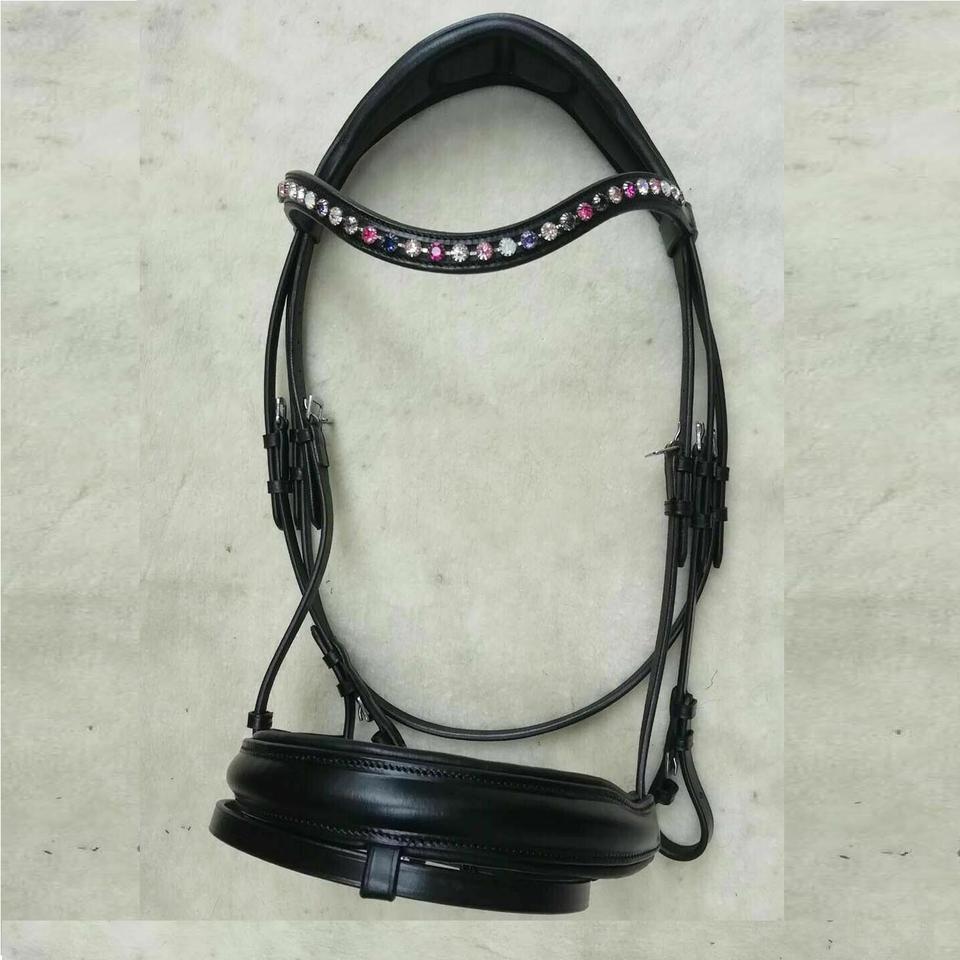 Brida de caballo anatómica de alta calidad, banda para la nariz, charol con diamantes de imitación, tambor vegetal, cuero teñido, cómodo equipo de equitación