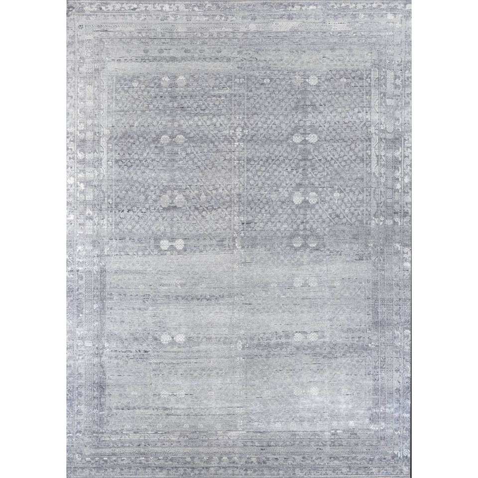 Alfombra de Lana Anudada a Mano Erbe Blue AKWL-1134 9x12 Rectangular con Patrón de Medallón para Decoración de Sala de Estar