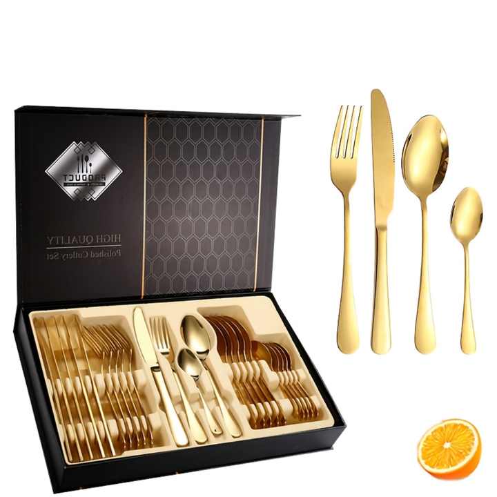 Juego de Cubiertos de Acero Inoxidable Europeo 1010 para Regalo Empresarial, 24/16 Piezas, Caja de Regalo Dorada, para Uso Doméstico, Vajilla Occidental