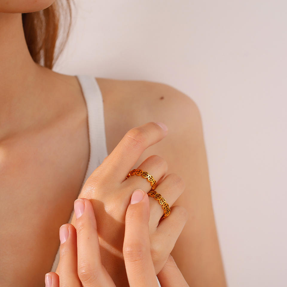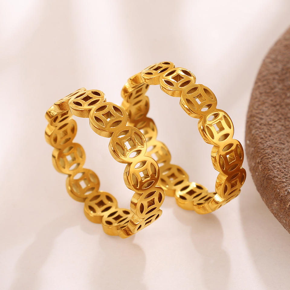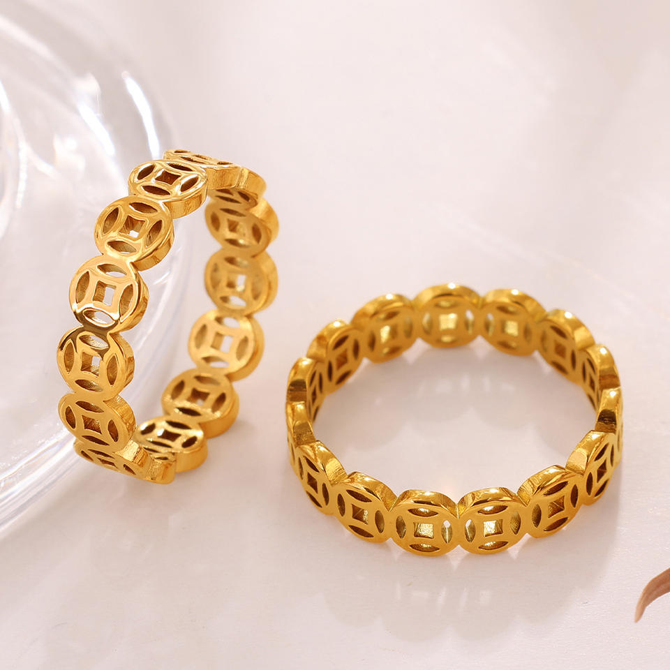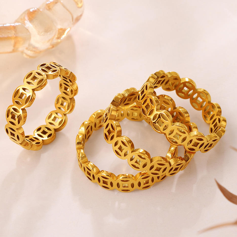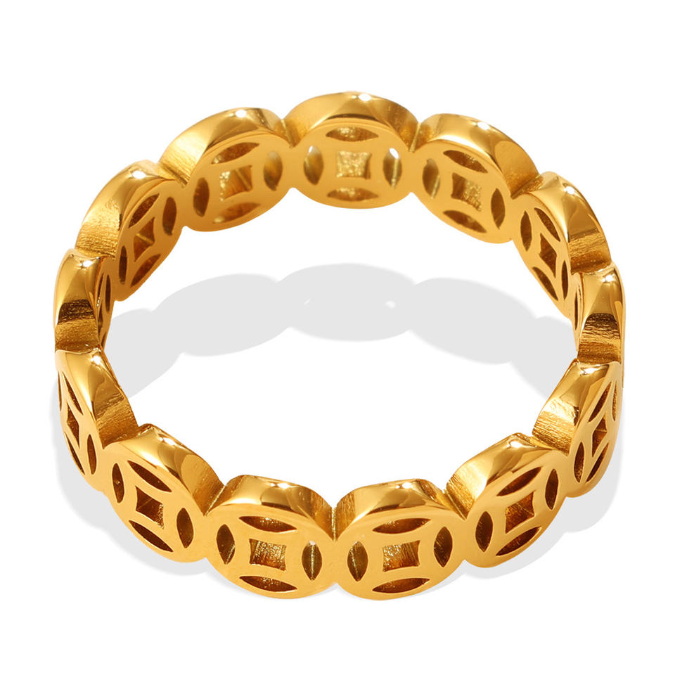 Anillo de cobre con diseño de moneda europeo-americano, oro calado, 18k, lujo ligero, diseño de nicho, auspicioso, apilable, unisex, a la moda