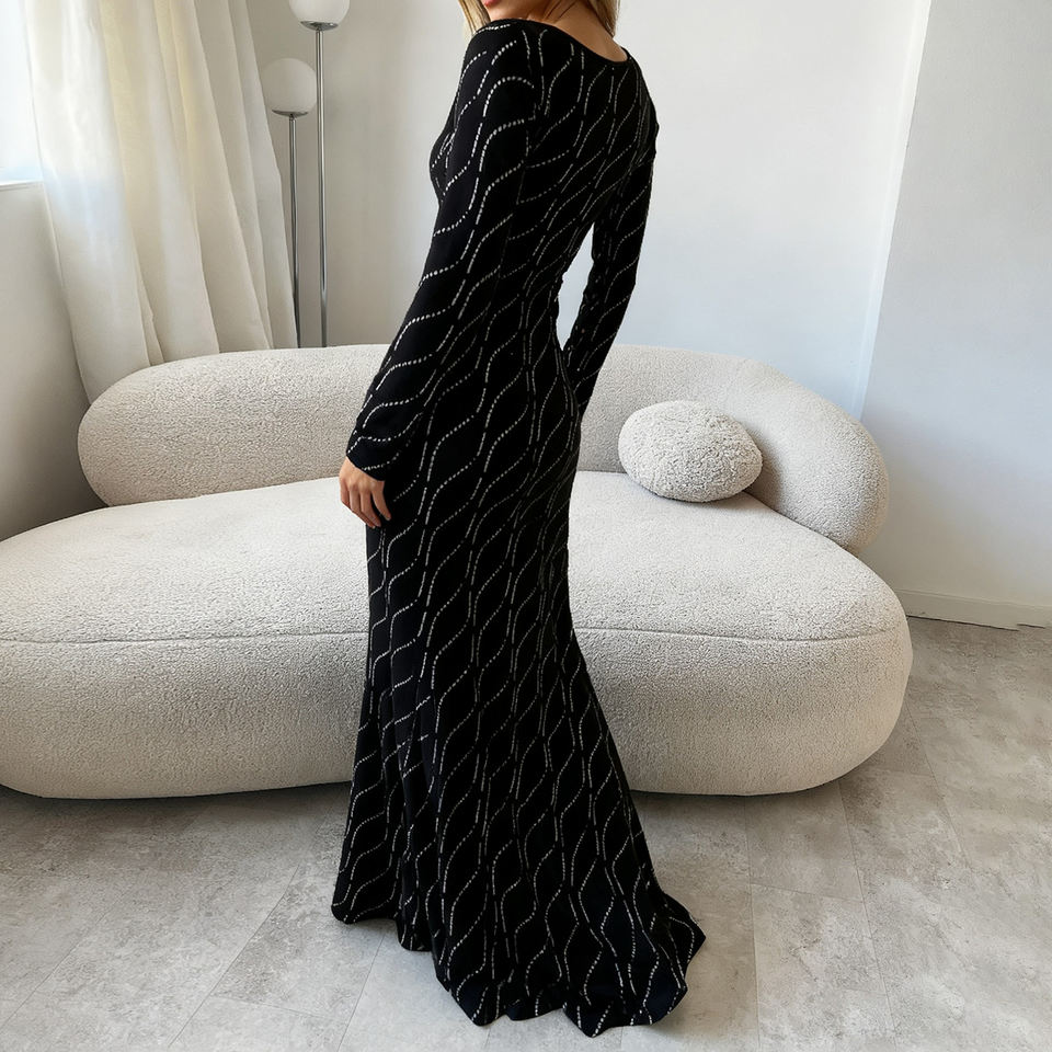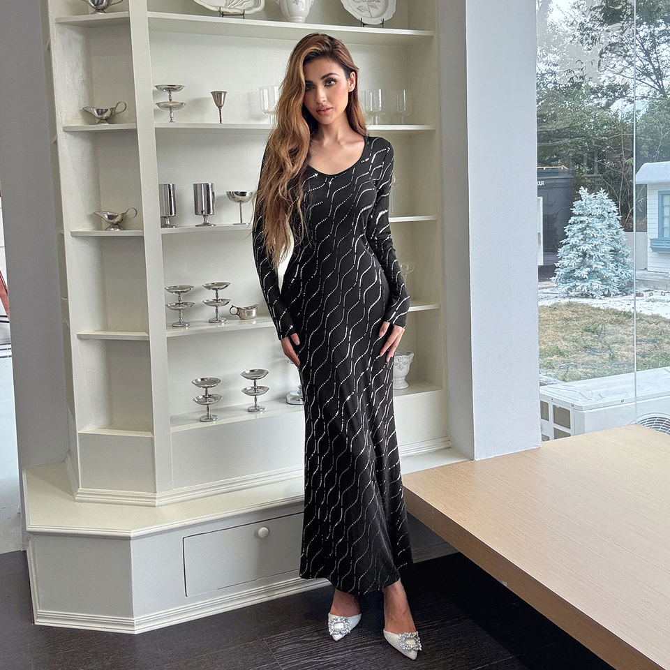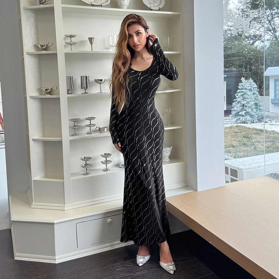 Vestido Elegante Estilo Europeo Americano con Estampado de Pedrería, Manga Larga, Lentejuelas Brillantes, Cuello Redondo y Corte Sirena