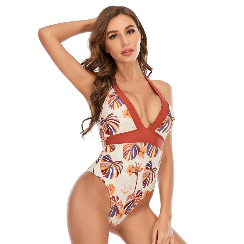 Traje de baño deportivo de una pieza con estampado de patrón sólido elegante para mujer americana europea, diseño trasero recortado, transpirable, respetuoso con el medio ambiente