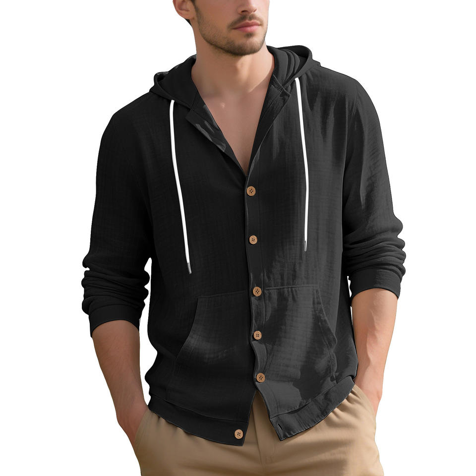 Cárdigan con Capucha de Manga Larga para Hombre, Estilo Europeo, Color Sólido, Algodón y Lino, Casual, Transpirable, con Botones y Dobladillo Redondo