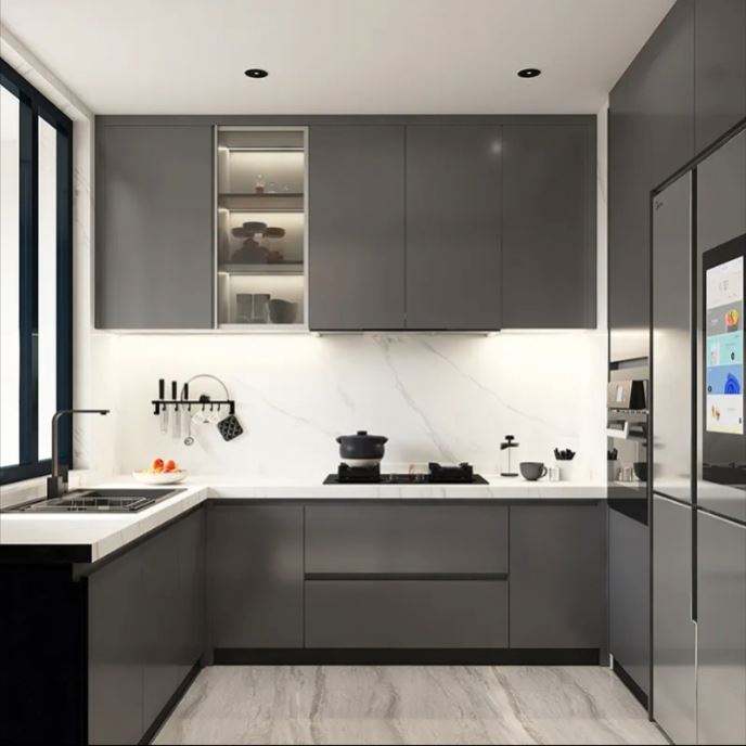 Muebles de Cocina Modernos de Diseño Europeo, Gabinetes de Cocina en Forma de L de Melamina Blanca de Lujo Personalizados y Vitrina de Vidrio