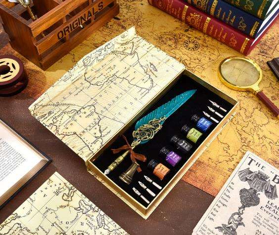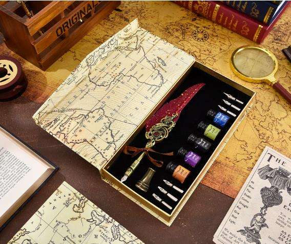 Juego de bolígrafos de plumas con alas de llama de estilo retro europeo con un ancho de escritura de 0,7mm con una caja magnética y diseño de mapa