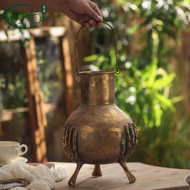 Jarrón de Metal Retro Europeo, Forma Irregular, Diseño Rústico Hecho a Mano, Adorno Floral para Escritorio