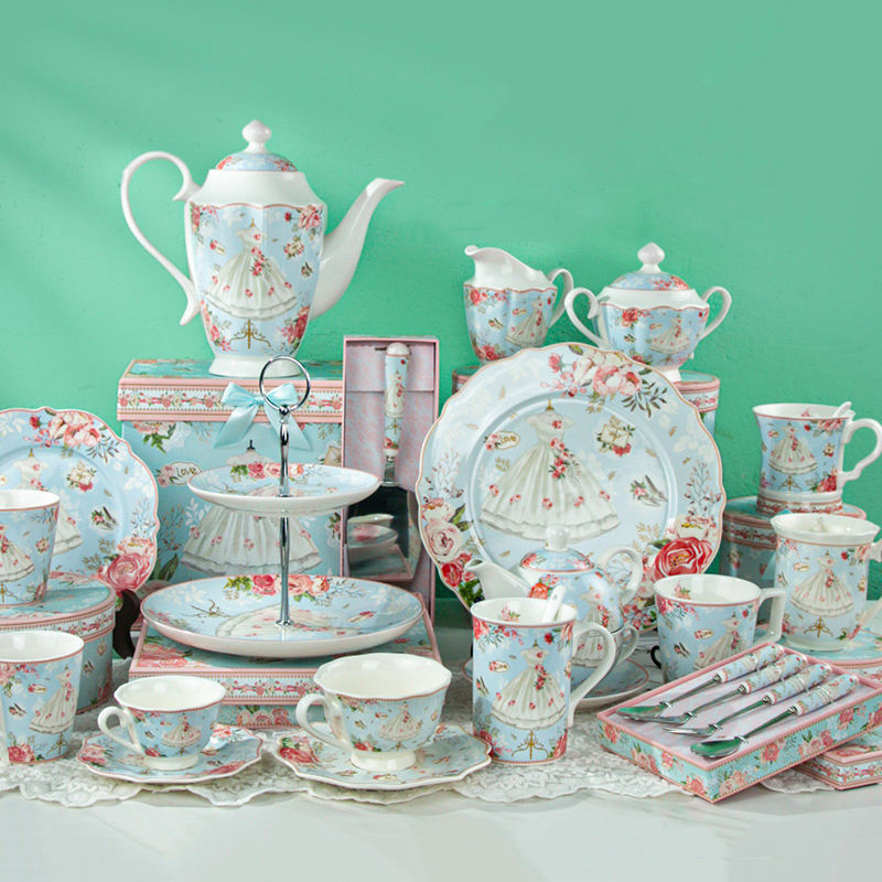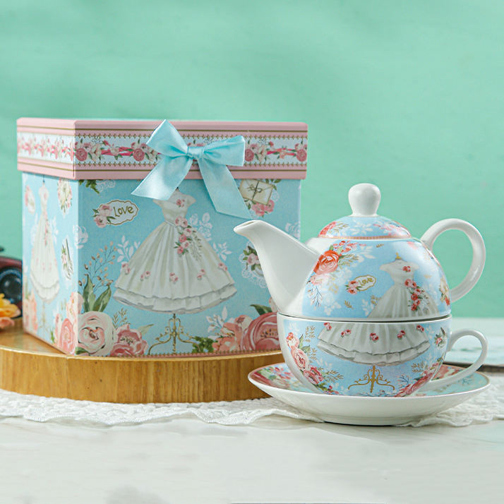 Juego de Café Estilo Europeo en Caja de Regalo, Juego de Té de Cerámica con Tetera, Taza de Té con Estampado de Vestido de Novia y Juego de Platillos