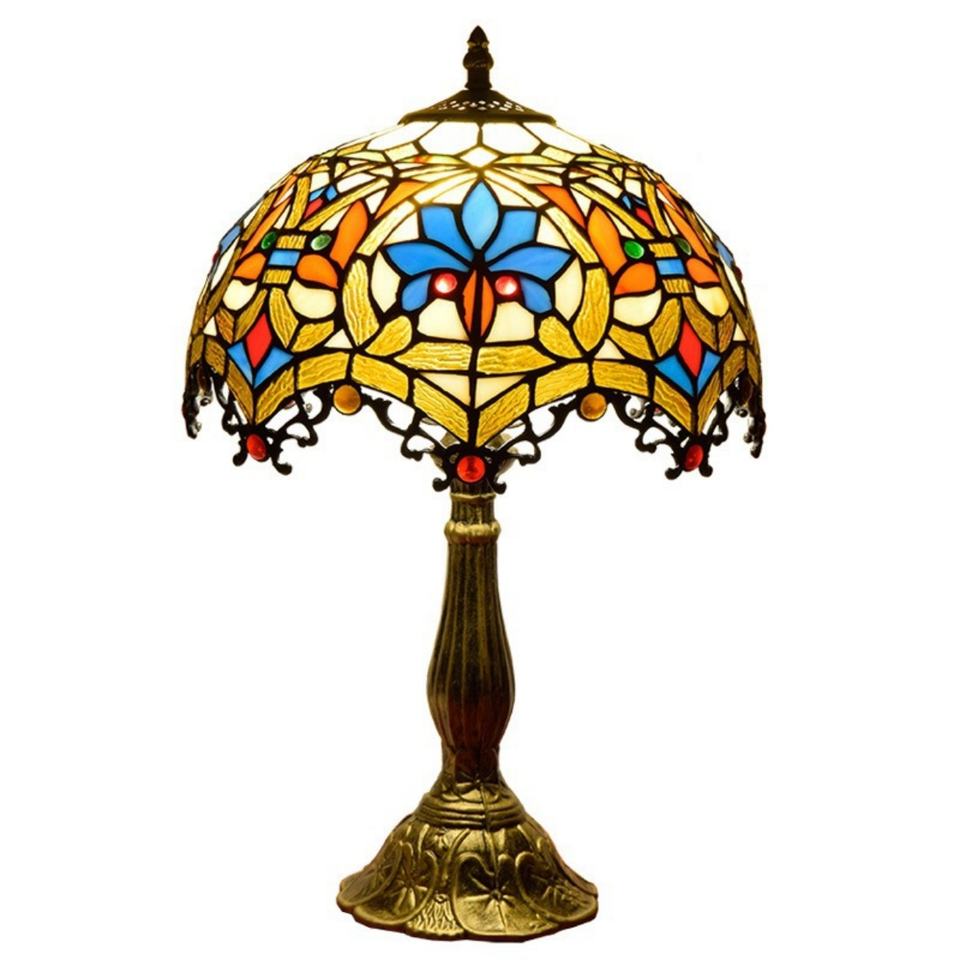 Lámpara de Mesa Tiffany de Estilo Europeo E27 con Pantalla de Cristal de Colores y Base de Resina Esmaltada para Decoración de Dormitorio o Comedor