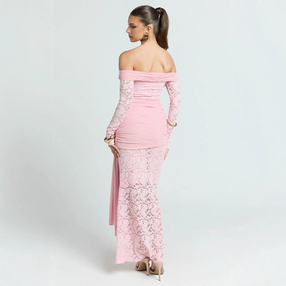 Vestido de Noche Elegante de Estilo Europeo con Encaje, Hombros Descubiertos, Espalda Descubierta, Manga Larga y Detalle de Lazo, Corte Ajustado