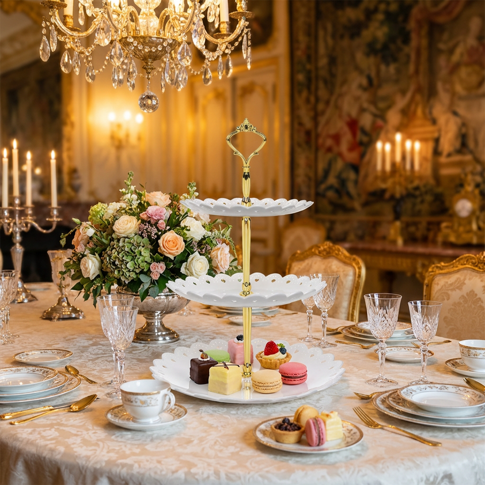 Soporte de Postres de Plástico de Tres Niveles Estilo Europeo con Diseño Giratorio y Gran Capacidad de Carga para KTV, Bodas y Bandejas de Dulces