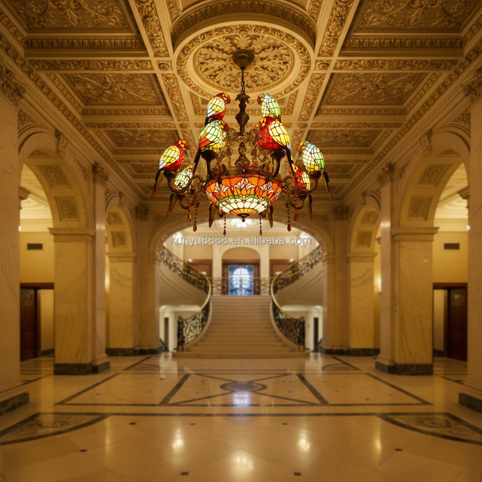 Lámpara de Araña de Estilo Europeo Tiffany con Vidrio de Colores LED de 12 Cabezas con Diseño de Loros para Iluminación y Decoración de Sala de Estar, KTV y Villas