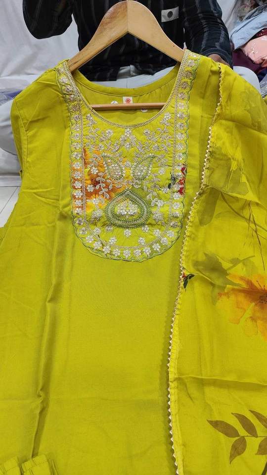 Rayón de diseño Evergreen con bordado Kurti Pant y Dupatta