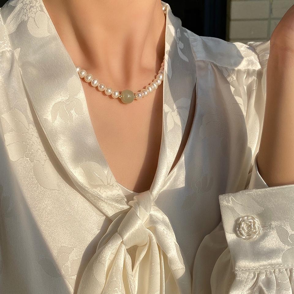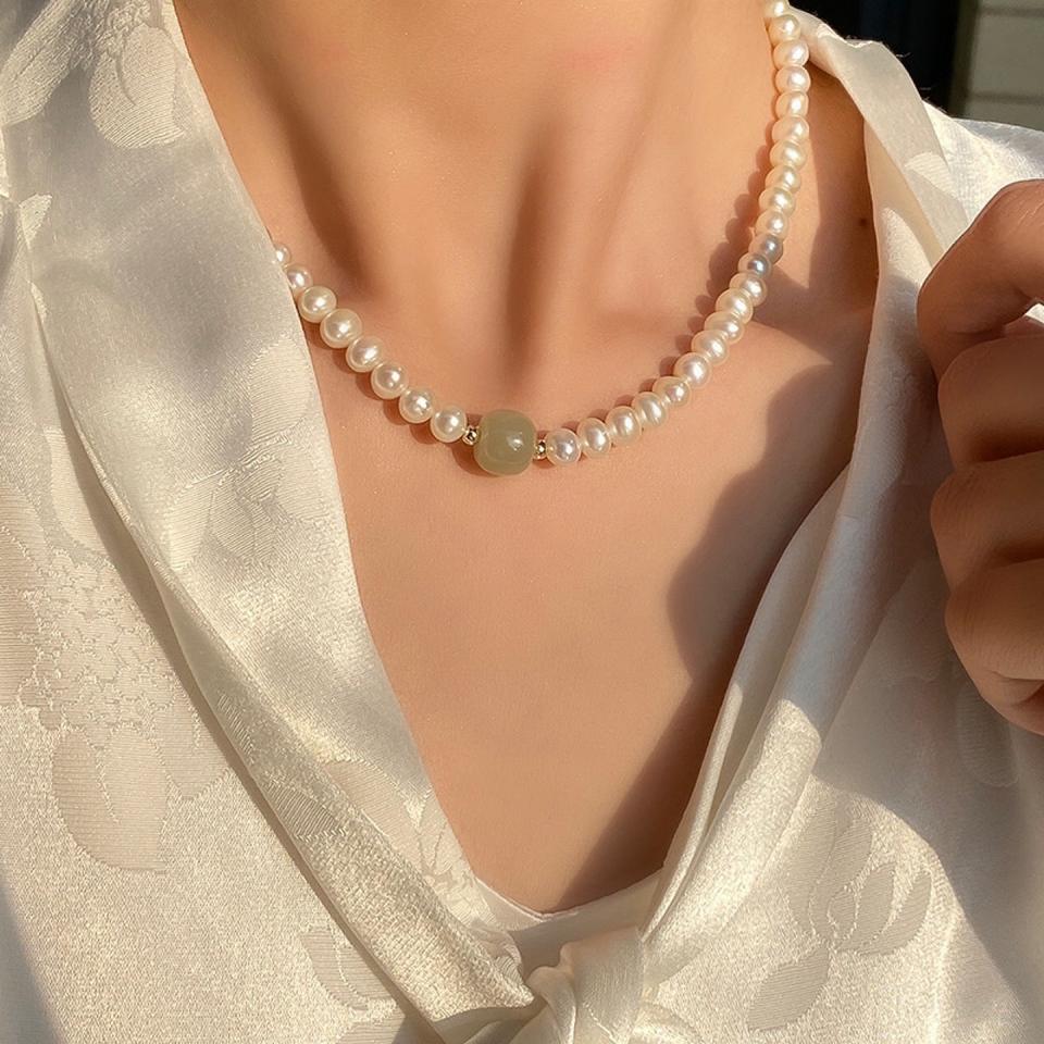 Collar de Perlas de Agua Dulce con Jade Verde Natural de Hotan, Chapado en Oro de 14K, Estilo Lujoso y Elegante
