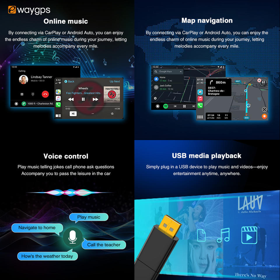 GPS, Estéreo, CarPlay, Android auto, Micrófono incorporado, Imagen en la imagen, Pantalla dividida, Coche de Control de volante, Altavoz incorporadoFunción