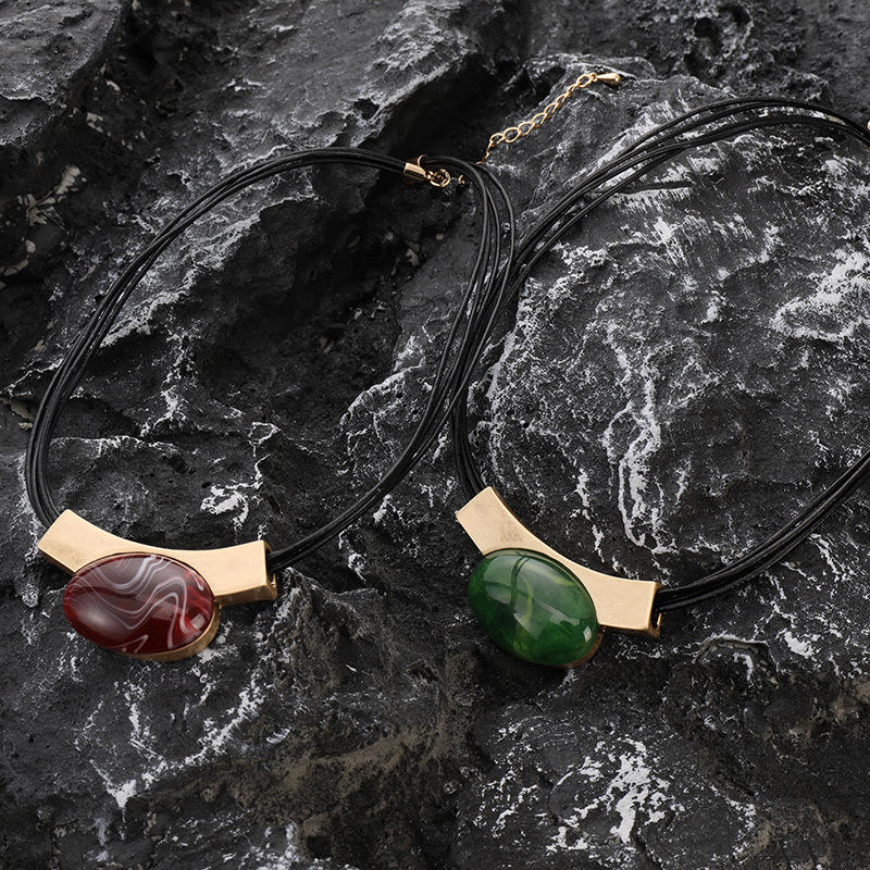 Collar con Colgante de Cristal Rojo de Diseño Exagerado, Collar de Piedras Preciosas con Cuerda de Cuero y Gema Verde para Mujer