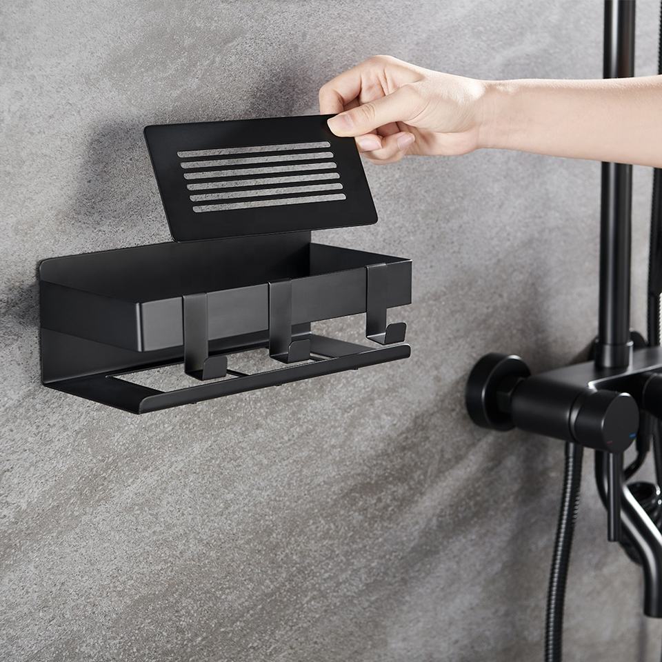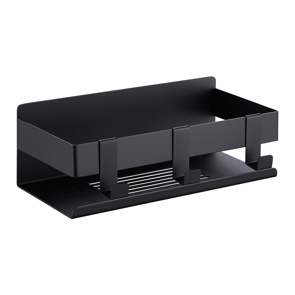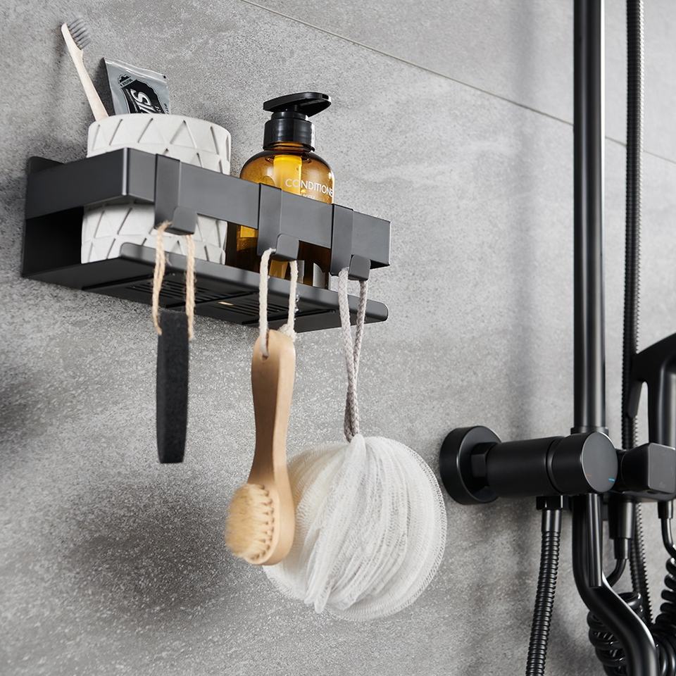 Estante de almacenamiento de ducha de baño, adhesivo de acero inoxidable, antióxido, color negro mate, fácil de instalar, sin perforación