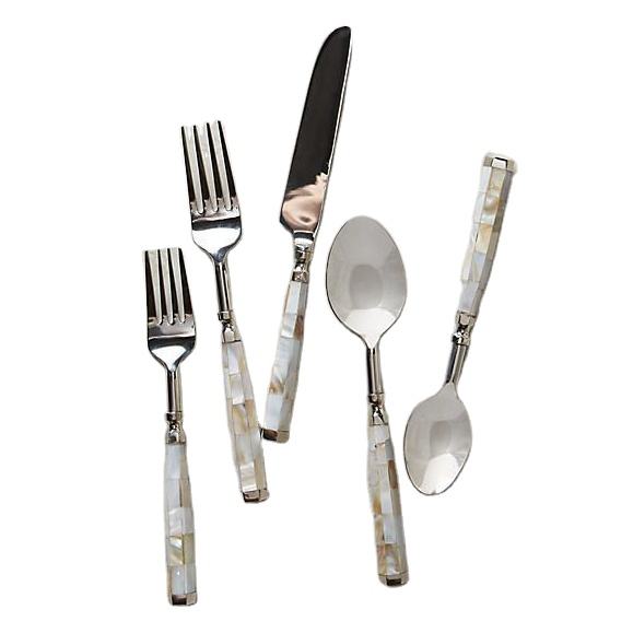 Juego de cubiertos de metal dorado de excelente diseño con mango de incrustaciones de nácar para el hogar y el hotel, juego de cubiertos de vajilla