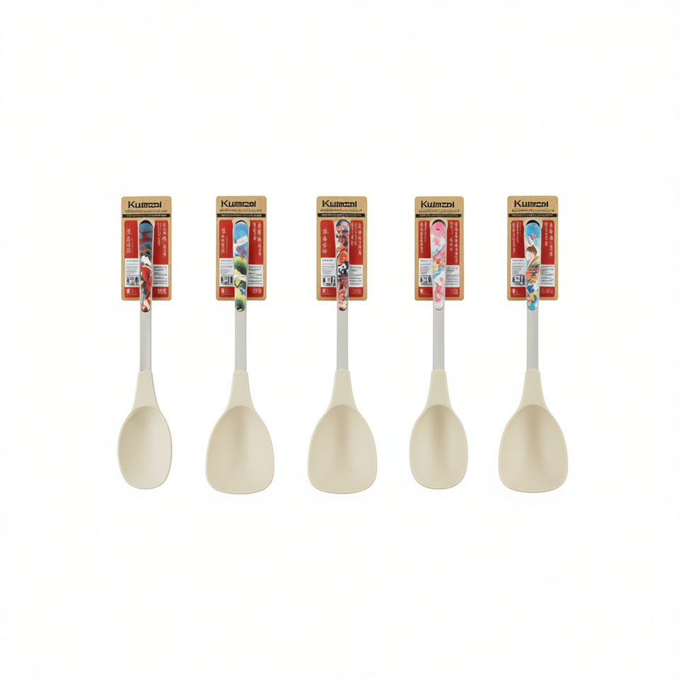 Set of 5 kitchen tools: ladle; spatula; spoon; skimmer; spaghetti server