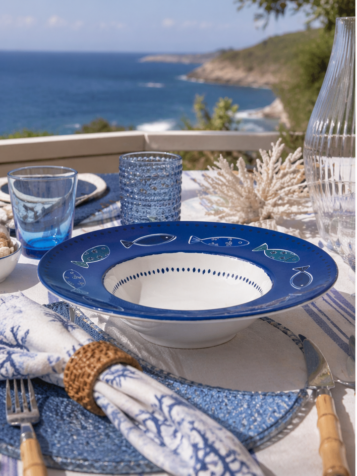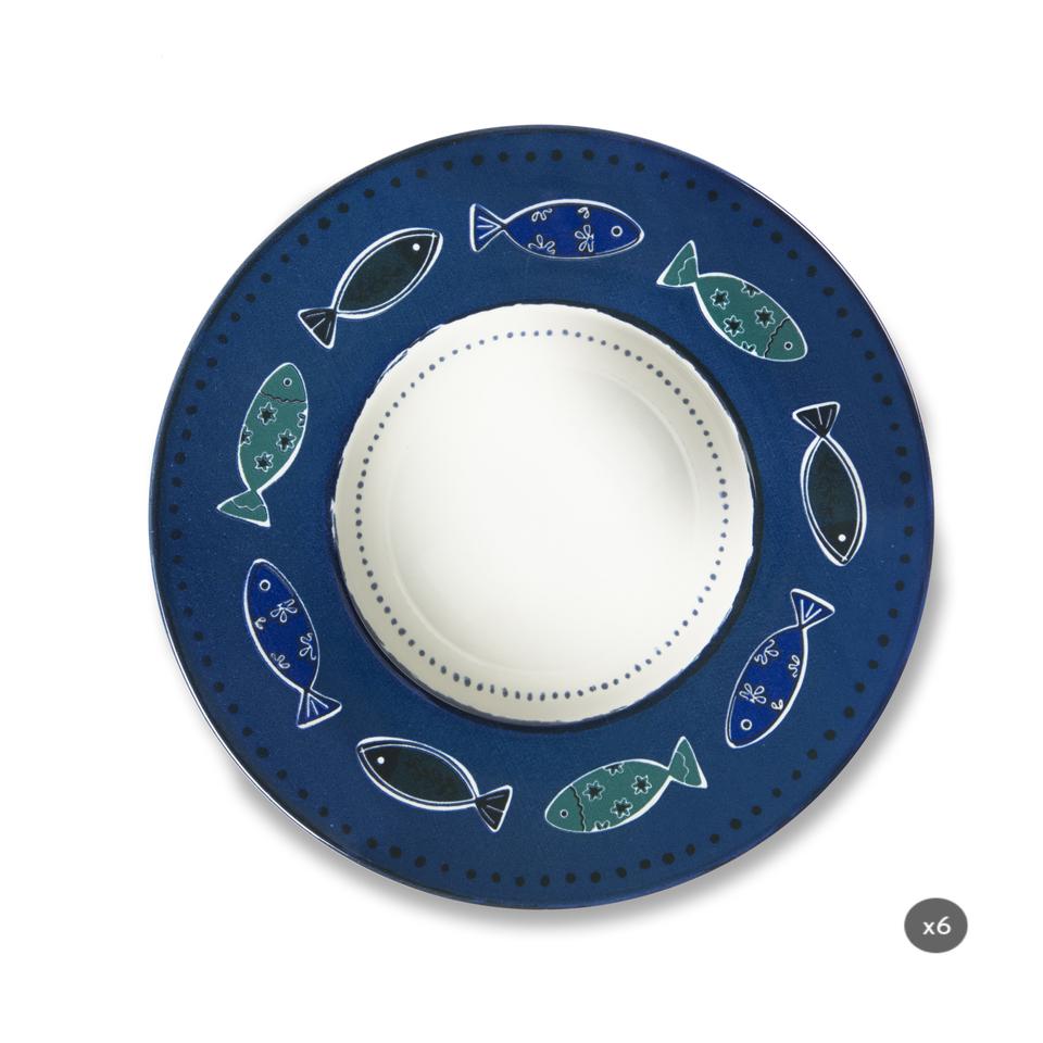 Juego de 6 Tazones Redondos de Cerámica para Pasta, Diseño Digital Mediterráneo Multicolor con Temática Marina, de Excelsa