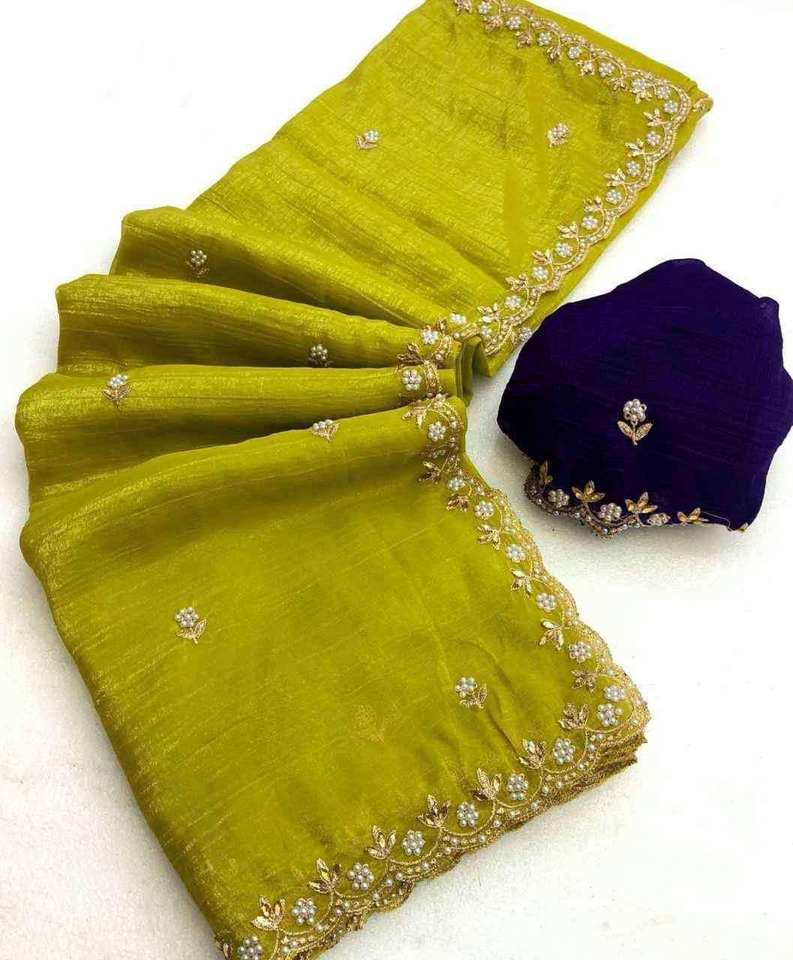 Diseño exclusivo de diseño tradicional, diseño de bordado con ambas manos de Sari, trabajo Moti y trabajo de diamantes, tela de seda Shiffron crujiente