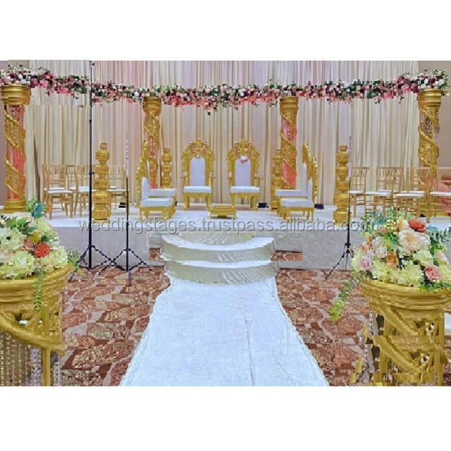 Exclusivo Mandap de Cristal Abierto para Bodas, Escenario Tradicional Dorado Tallado, Magnífico Mandap Dorado para Bodas en el Reino Unido