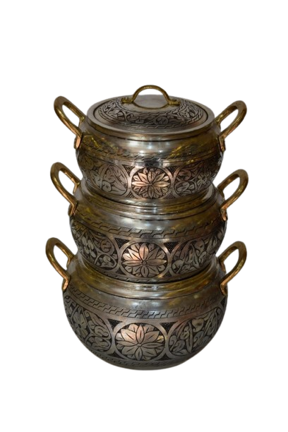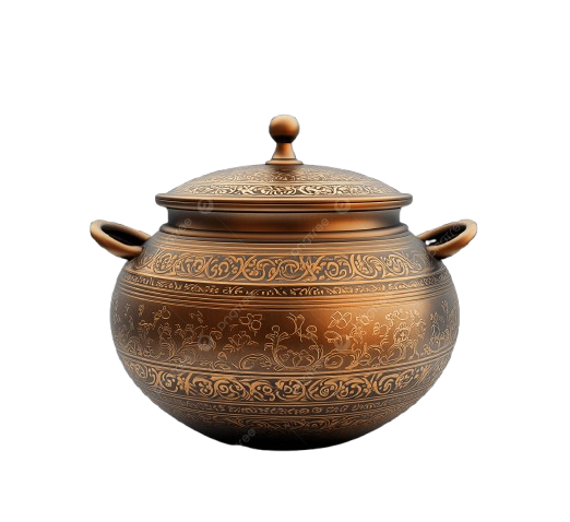 Olla de cocina de metal de calidad exclusiva en cobre con asas de metal para uso en el hogar, restaurantes y mesas de comedor.