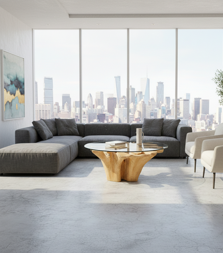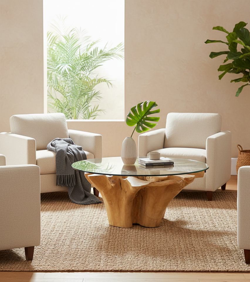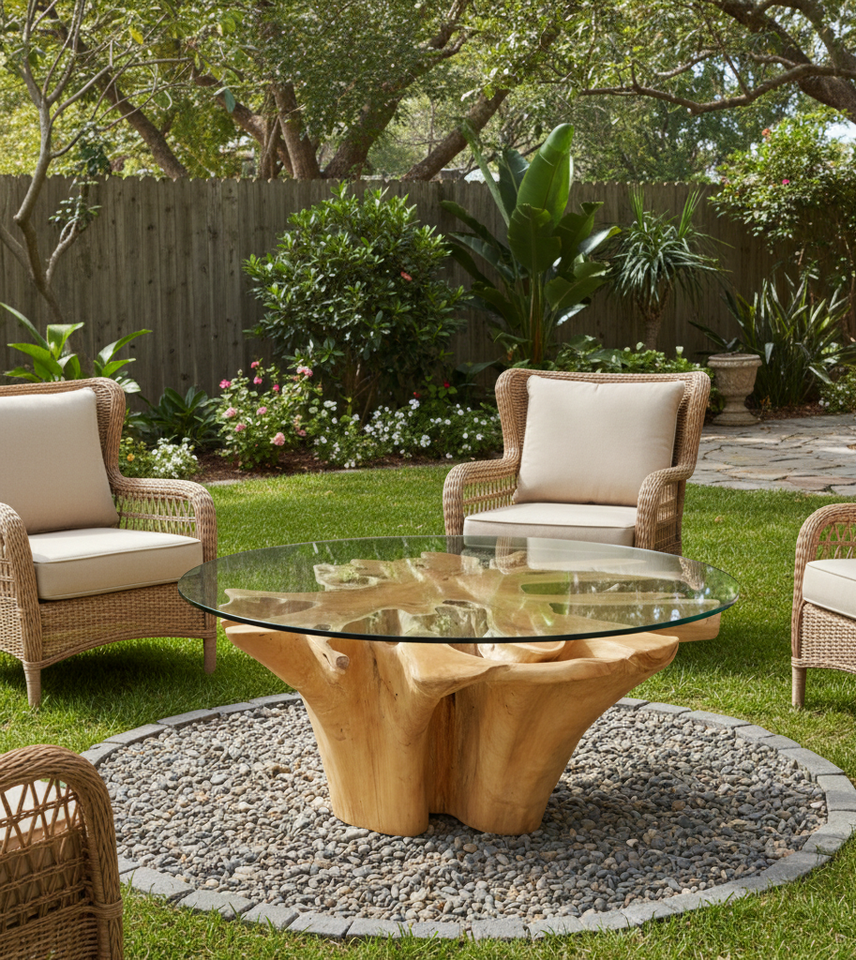 Exclusiva Mesa de Comedor Redonda de Raíz de Teca con Tapa de Vidrio Templado, Diseño Moderno, Madera Sólida Ecológica para Uso en el Hogar y Hoteles