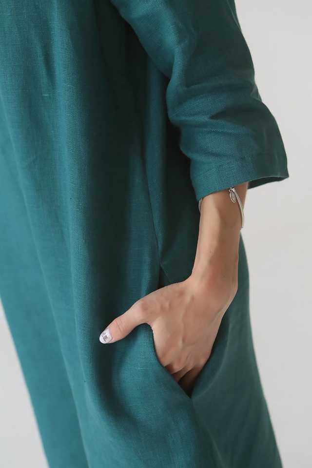 Experimente suave y agradable negro cuello redondo manga larga Sexy hasta la rodilla Formal sólido mujeres Lino tejido lavable vestido con botones