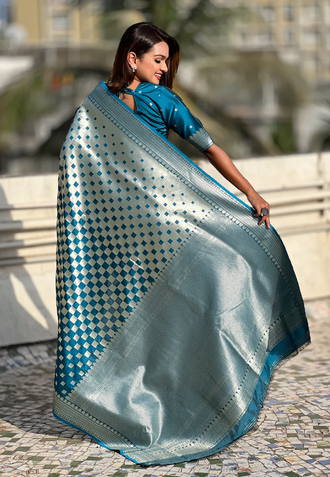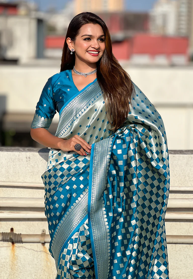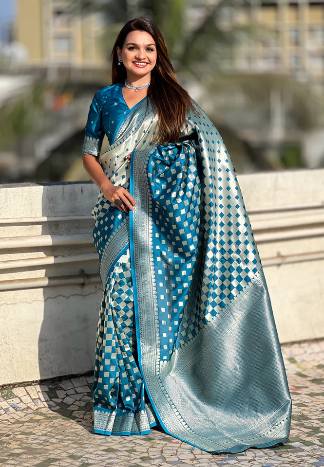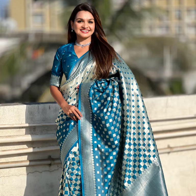 Sari Banarasi Suave Azul Impresionante con Zari 3D Tejido para Fiestas, Bodas y Festivales, Sin Arrugas, Protección Solar, Elegancia Étnica Atemporal