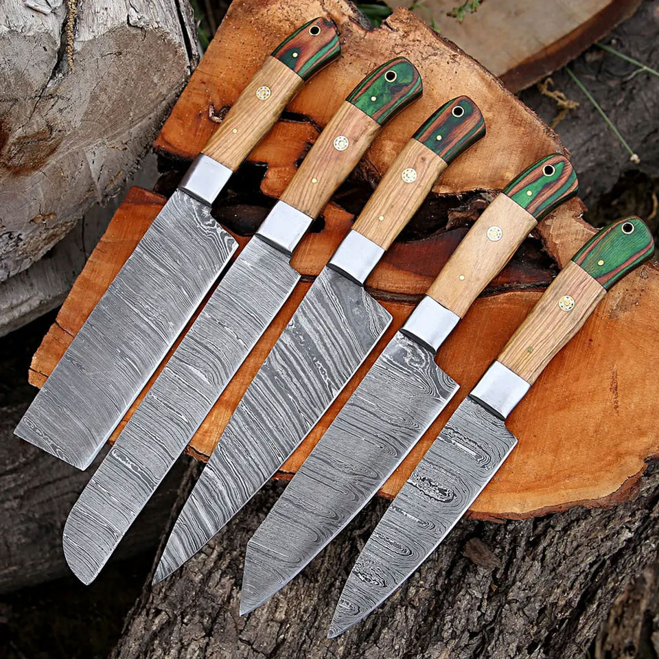 Juego de Cuchillos de Chef de Acero de Damasco Hechos a Mano de Grado Experto con Mango de Madera Ambidiestro de Cinco Piezas con Agarre Fuerte