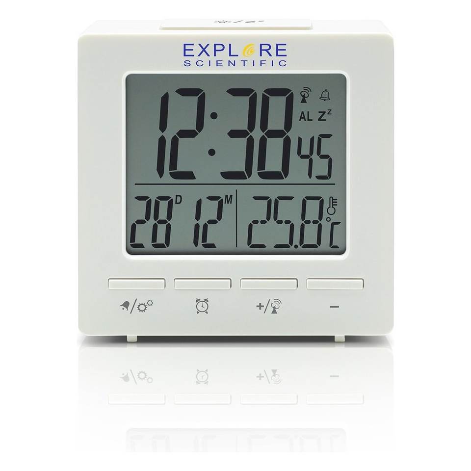 Reloj Despertador de Escritorio Multifunción con Control Remoto por Radio, Color Blanco, Modelo RDC1005 de Explore Scientific